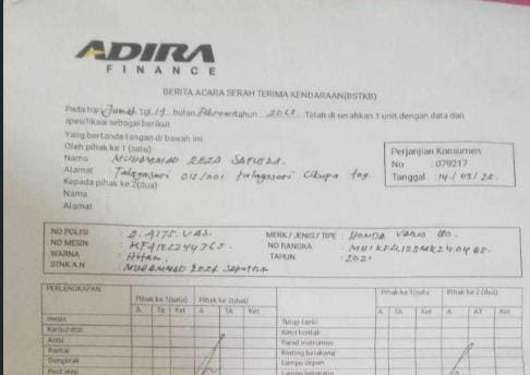 Beberapa hari, saya dan ditemani paman datang ke Kantor Adira, ternyata motor Vario Tecno sudah tidak ada di Kantor Adira. Usut punya usut ternyata oleh Pihak adira dikembalikan kepada pihak matel yang awal membawa unit tersebut. Yang lebih heran lagi unit yang dimaksud telah dijual oleh pihak matel atas persetujuan oknum pihak Adira dengan alasan sudah 86. Pertanyaannya 86 ama siapa,ternyata Unit tersebut telah dijual.