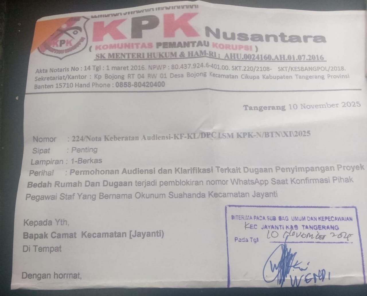 Kabupaten Tangerang | Antero.co – DPD LSM Komunitas Pemantau Korupsi (KPK) Nusantara kembali melayangkan surat kepada Camat Jayanti, dengan nomor 224/Nota Keberatan Audensi-KF-KL/DPC LSM KPK-N/BTN/XI/2025, pada Senin (10/11/2025).